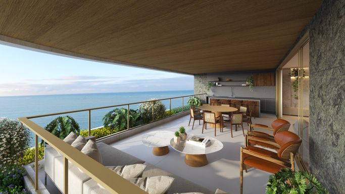 A varanda gourmet à beira-mar é um dos grandes destaques do empreendimento. Um espaço onde o tempo desacelera, ideal para contemplar o azul infinito do oceano, sentir a brisa marinha e viver momentos únicos ao lado de quem você ama. Aqui, o mar não é apenas uma vista, mas parte essencial do seu estilo de vida.